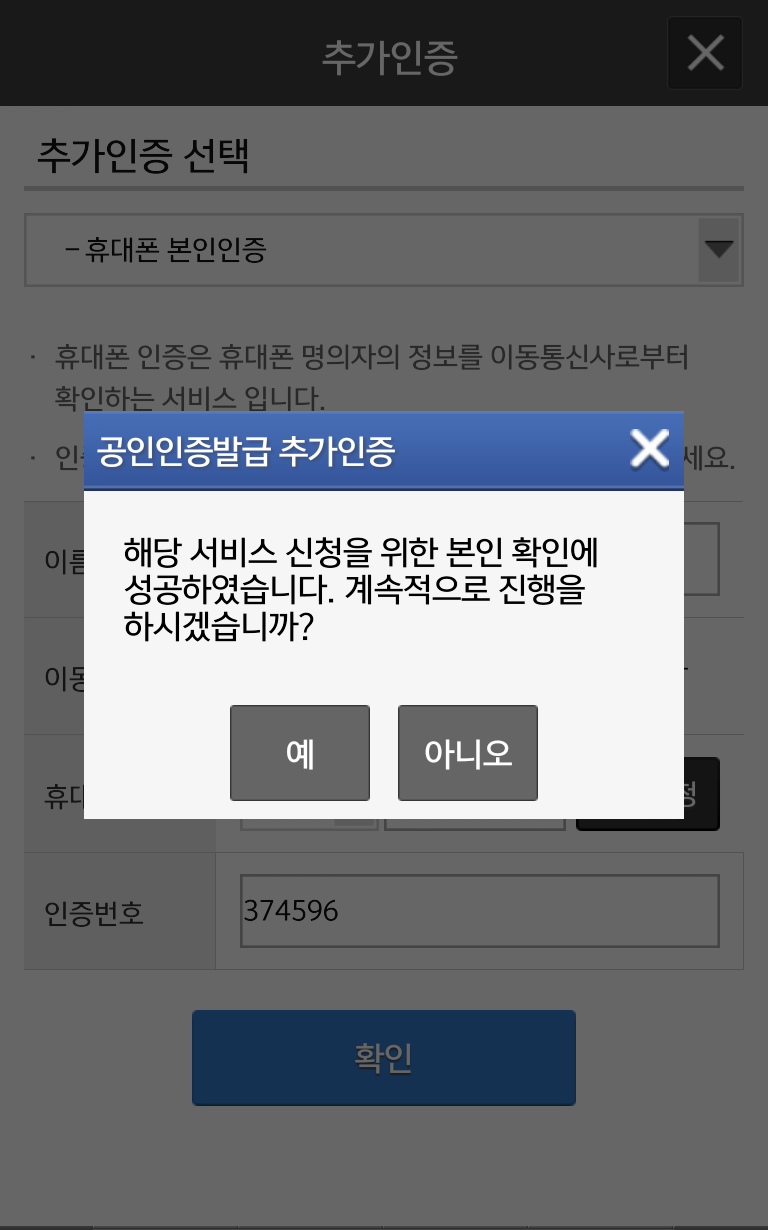 인증 요청 화면이 뜹니다. 그 인증 번호를 인증번호 란에 입력하고 확인 하기를 누릅니다.