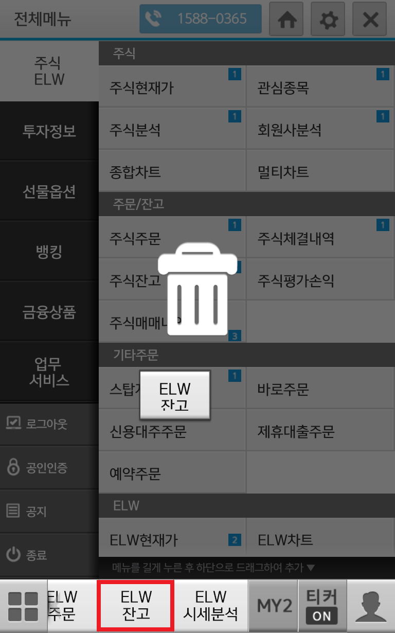 My Menu에서 제거를 해보겠습니다. 'ELW 잔고' 를 길게 누르시면 화면중앙에 휴지통그림이 뜹니다. 이곳으로 드래그 하시면 손쉽게 제거하실 수 있습니다.