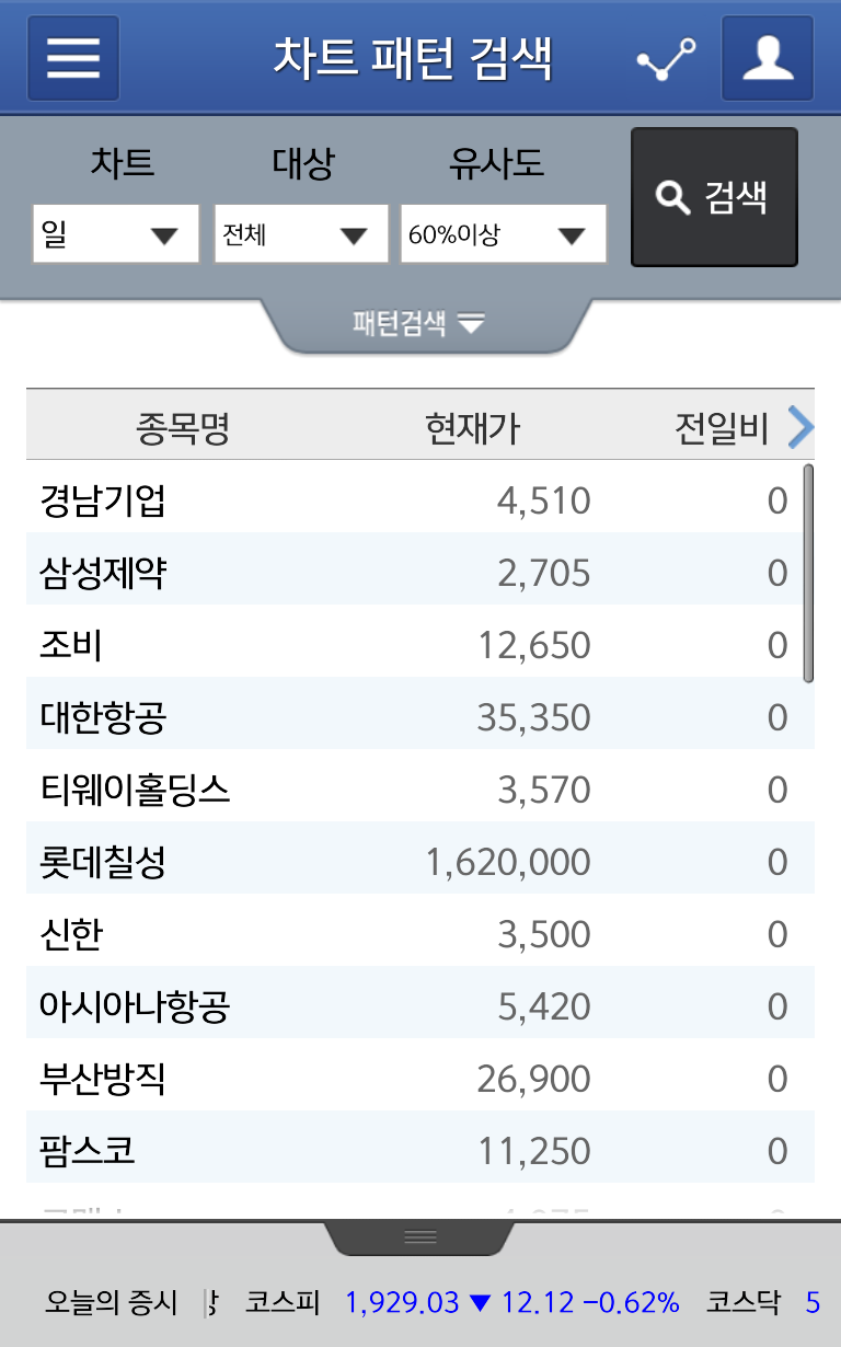 차트종류와 코스픽, 코스닥을 지정하고 유사도를 설정하여 차트패턴검색을 할 수 있습니다.