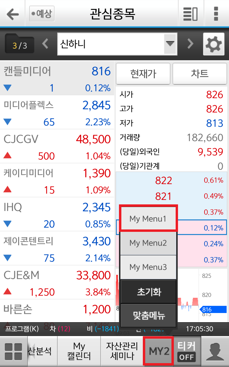티커' 옆에 있는 'MY2' 를 클릭해보겠습니다. 'MY2' 는 My Menu2를 의미한다는 것을 알 수 있습니다. 위에 있는 My Menu1을 눌러보겠습니다.