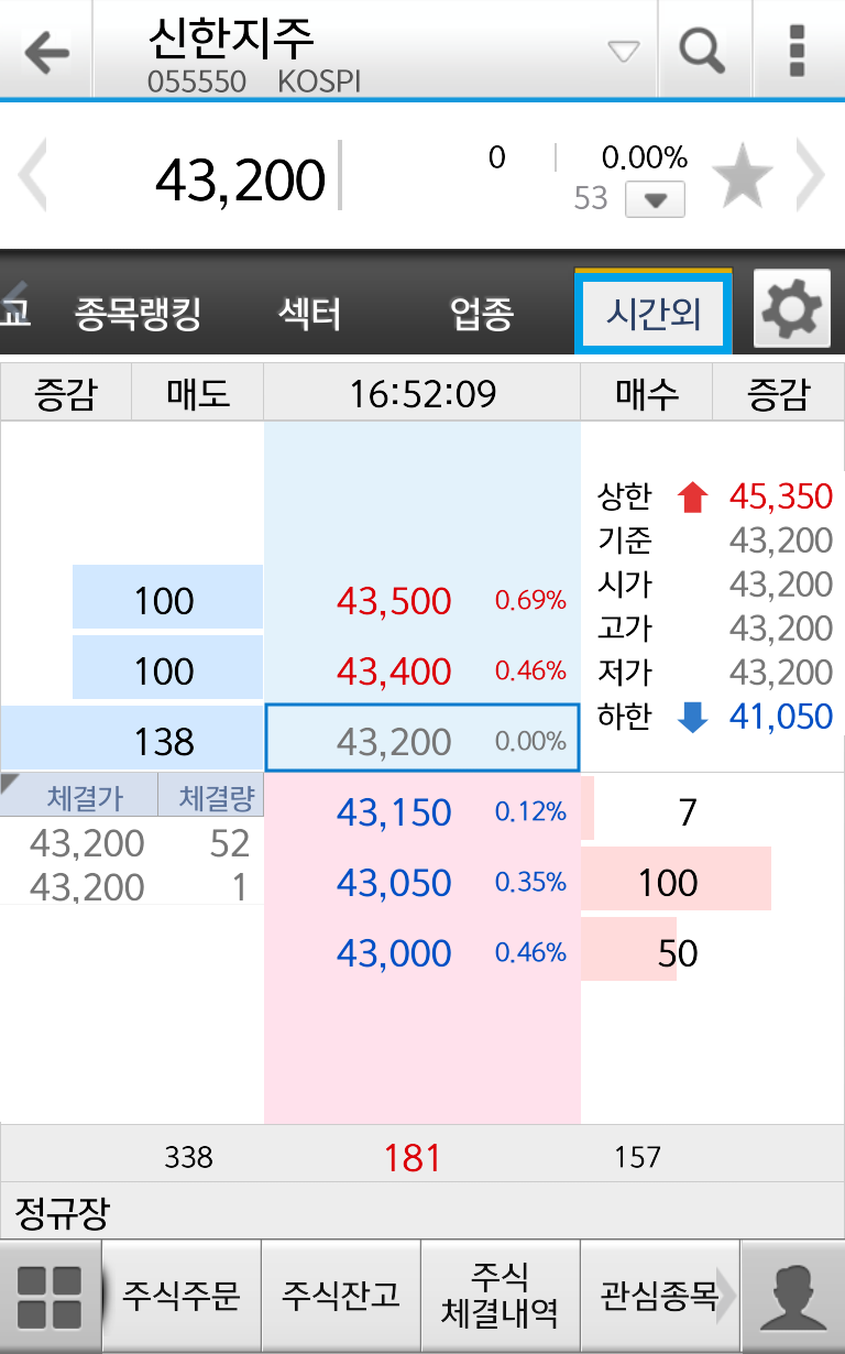 시간외 화면 입니다. 장이 끝나고 혹은 장이 시작하기전 매매 동향을 확인할 수 있습니다.