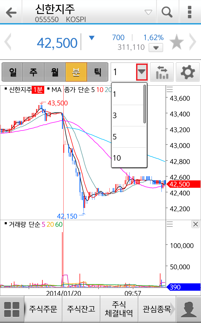 신한지주에 대한 분 단위의 가격 변화를 보여주는 분봉 차트 입니다.