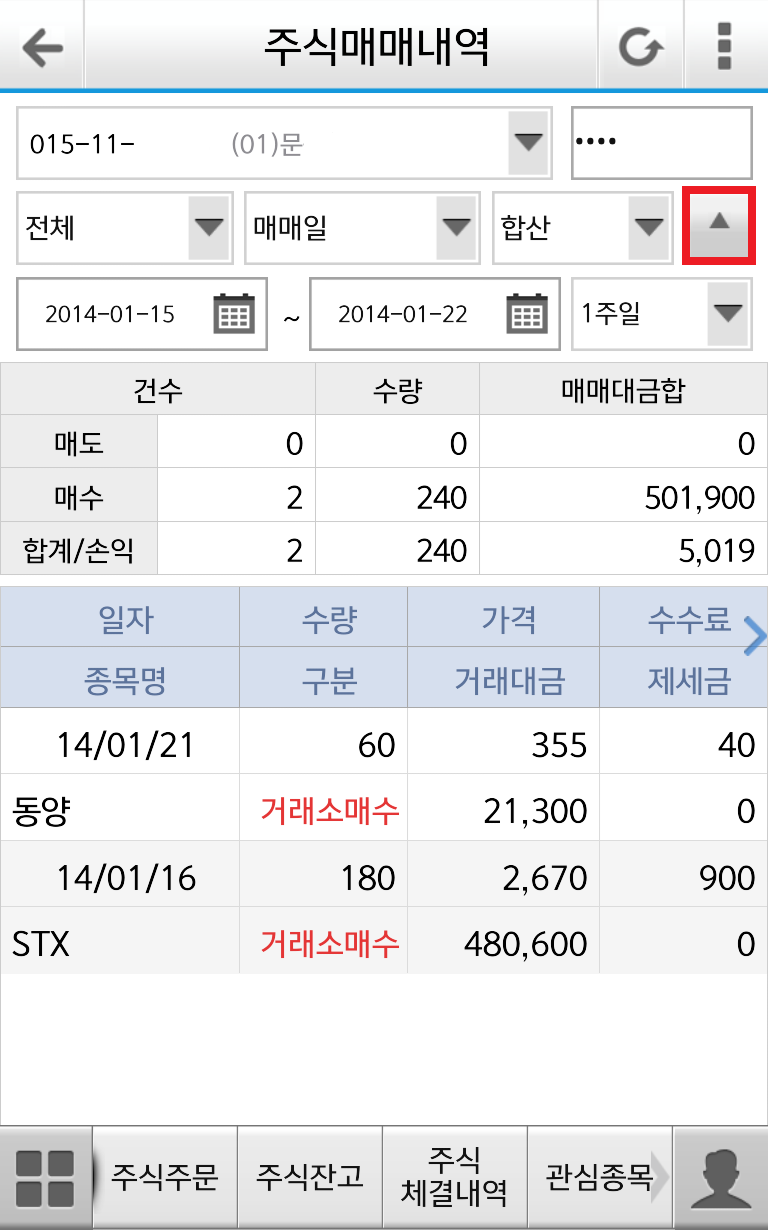 검색 설정한 기간동의 매수/매도 건수, 수량, 금액합에 대해 확인할 수 있습니다.