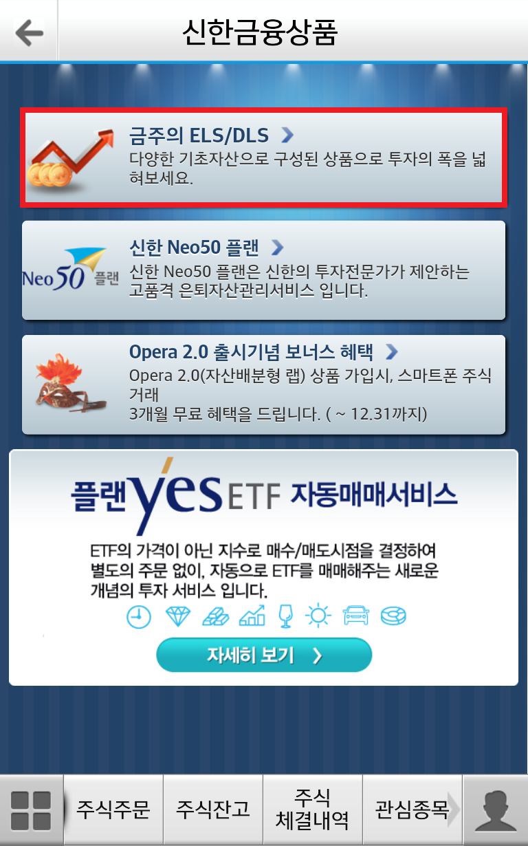 ※ 대표 금융상품을 지금 만나보세요!금주의 ELS/DLS, Neo50플랜, Yes ETF 자동매매 서비스 메뉴가 있습니다.