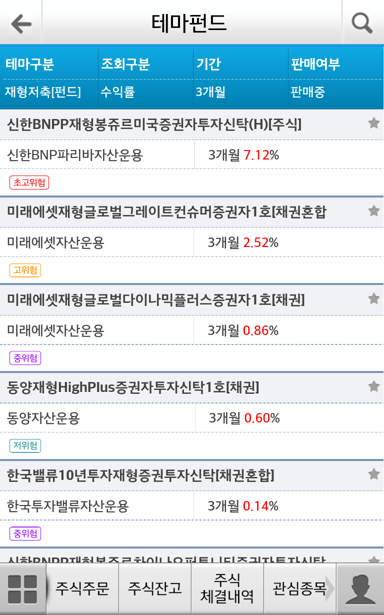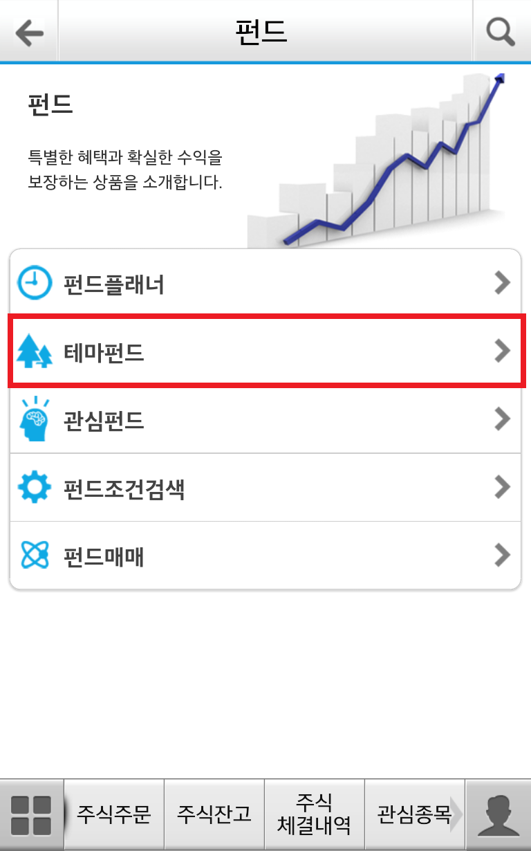 ※ 펀드 신청 이제 어렵지 않아요~펀드를 자신의 취향에 맞게 검색 할 수 있으며. 테마 펀드 항목도 있습니다. 또한 주식처럼 관심펀드로 등록하여 쉽게 볼 수 있습니다.