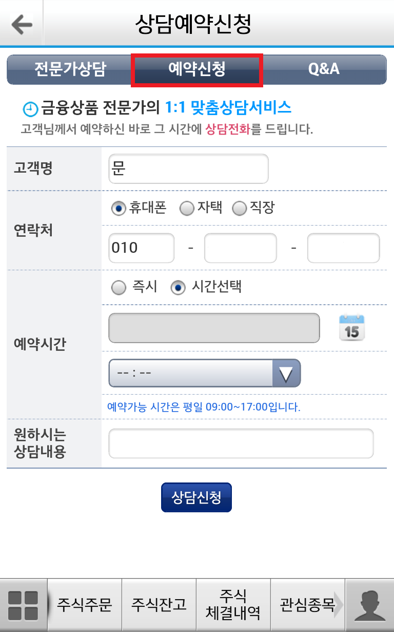 금융 상품 전문가와의 1:1 맞춤 상담 서비스를 원하면 예약신청을 이용해 예약을 잡을 수 있습니다.