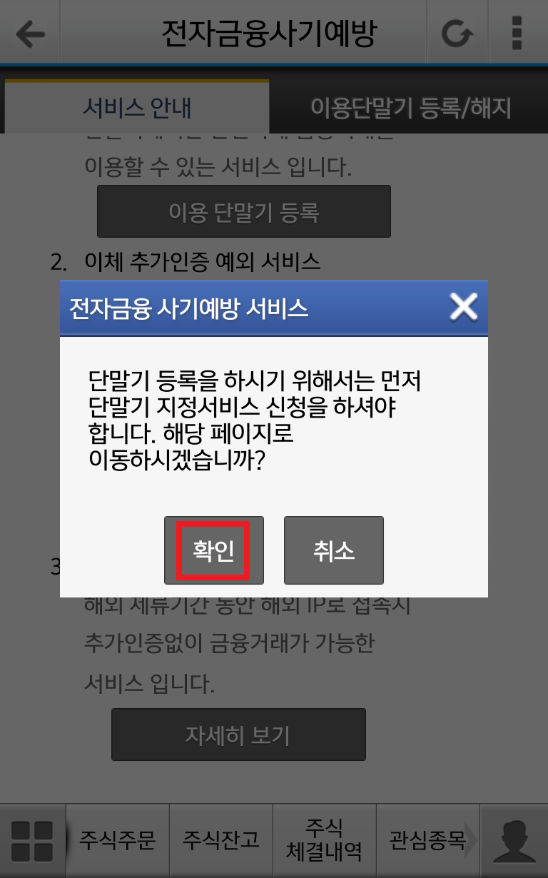단말기 지정서비스 신청을 할 수 있도록 '확인' 버튼을 누릅니다.